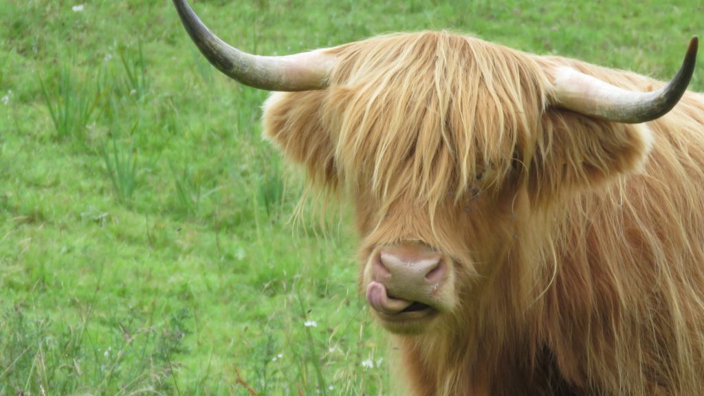 Fortunately we walked a lot on our journey. We saw lochs (lakes), bens (mountains), corries (steep-walled mountain basins), glens (narrow valleys), and coos (Highland cows). He thinks the grass is great.